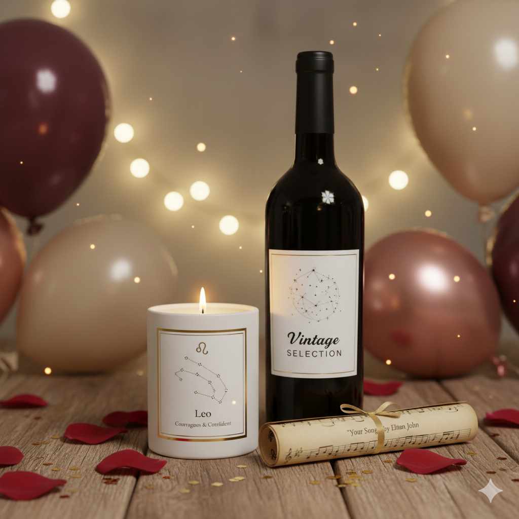 • 🤩Premium All-Inclusive Gift Bundle: Gift Bundle with balloons, wine, assorted fresh fruits, snacks, nuts, Cadbury Chocolate Bar and Finger Biscuits, mini cheesecake, and a personalized Zodiac sign-themed candle featuring their name and a powerful affirmation! Plus, an additional song of your choice - $350